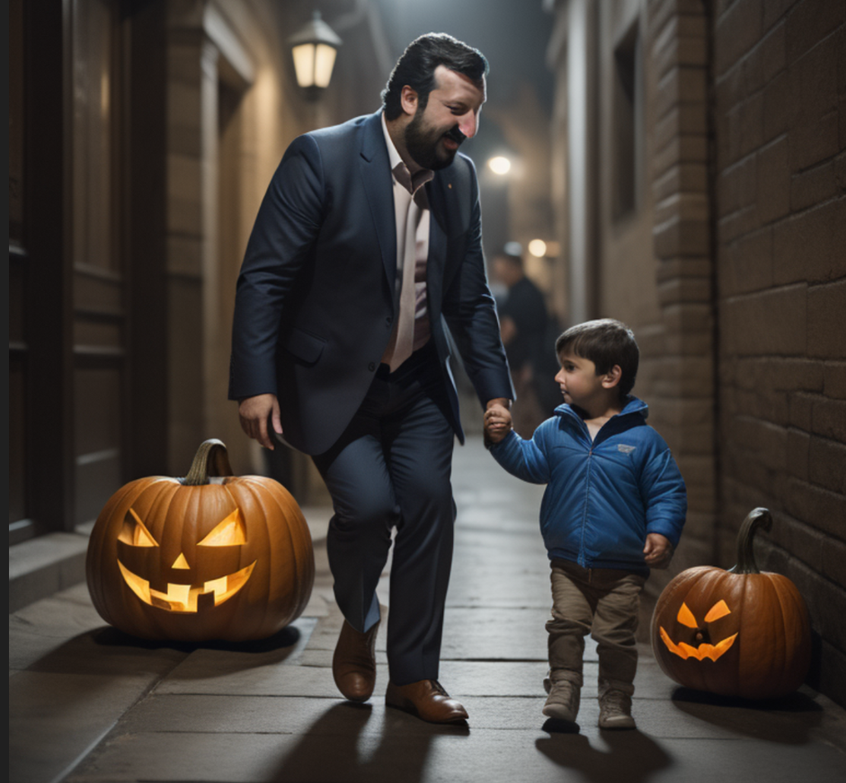 È Halloween, la notte delle streghe. Salvini e il nipote novenne Alberto vanno in giro a chiedere dolciumi.
