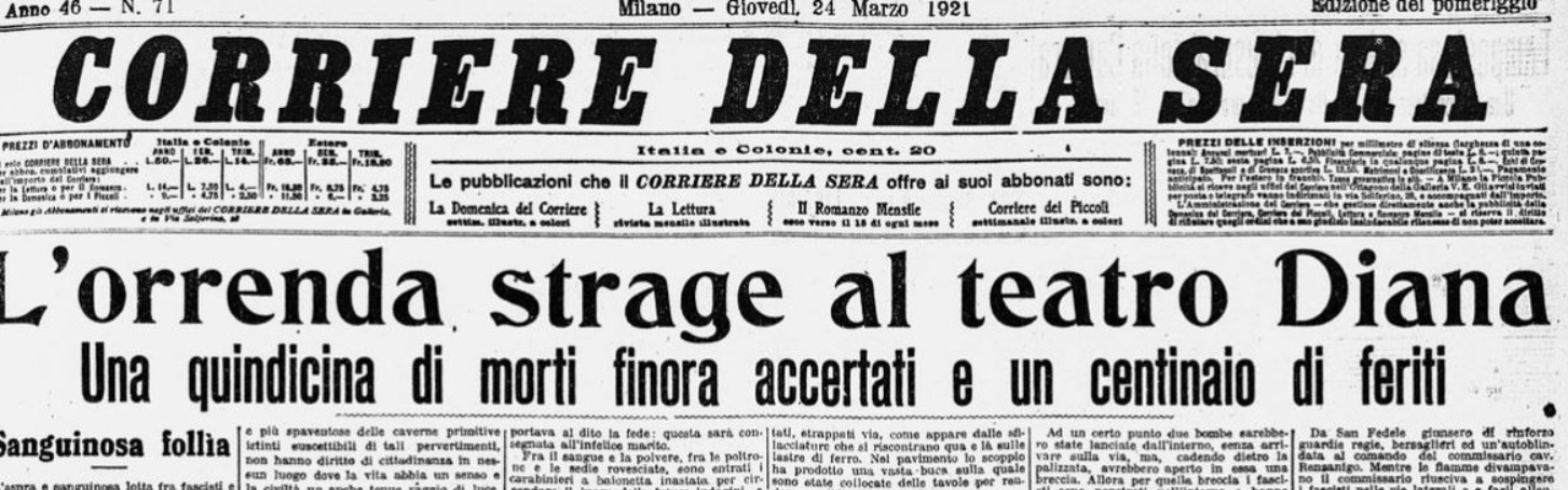 23 marzo 1921. Alle 22:40 una tremenda esplosione fa saltare in aria le prime file delle poltrone e la buca dell’orchestra al Teatro Diana di Milano, causando 21 morti e 80 feriti. Il pubblico in sala attendeva l’inizio del terzo atto de La Mazurka blu, la celebre operetta del compositore austriaco Franz Lehár. Il bilancio sarebbe stato ancora più grave se l'ordigno fosse deflagrato all’interno della sala. Invece era stato piazzato all’esterno, in via Paolo Mascagni. Lo testimoniarono, riporta il Corriere della Sera del 24 marzo 1921, le saracinesche dei negozi che furono «completamente strappate, contorte e accartocciate come rotoli di carta: tutte le armature di ferro divelte e lanciate lontano o nel fondo delle botteghe: cornicioni, capitelli, tratti di muro furono distrutti o abbattuti». La responsabilità fu attribuita ai gruppi anarchici milanesi e, in un secondo momento, ai fascisti (il 23 marzo cadeva il secondo anniversario della fondazione dei fasci di combattimento), che ne sfruttarono l’ondata emotiva per preparare la Marcia su Roma, il 28 ottobre 1922. Eppure l'episodio, assai cruento, rimane ingiustamente negletto, trascurato persino dalla mitologia antifascista. Neppure un’ora dopo l'esplosione, quando è ancora incerta la matrice dell’attentato, le squadracce si dirigono verso la sede dell’«Umanità Nova», il giornale degli anarchici, e la devastano in segno di rappresaglia. Ma la pista anarchica viene subito cavalcata anche dai principali mezzi di comunicazione che parlano di «orrenda strage anarchica» e di «attività anarchica che è diventata sempre più intensa». Sempre un’ora dopo la strage, un’altra esplosione prese di mira la centrale elettrica. Sul posto venne arrestato Amleto Astolfi, un meccanico diciottenne di simpatie anarchiche. Proprio mentre al Diana cominciavano ad affluire i primi soccorsi, in un altro quartiere meneghino i carabinieri fermarono una carrozza che, secondo la velina delle forze dell'ordine, procedeva di corsa verso la sede del giornale socialista “Avanti!”.