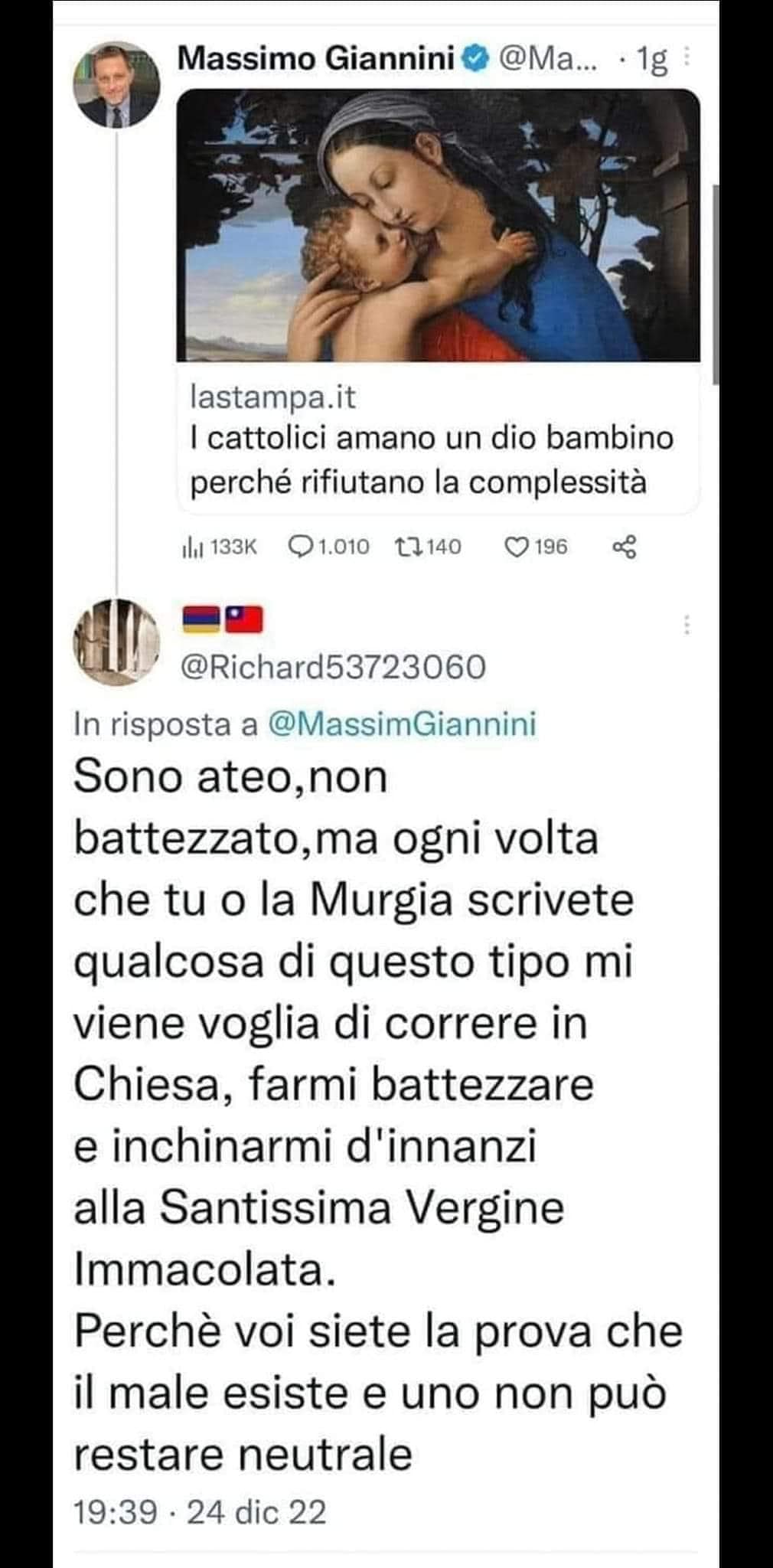 Proprio per questo affermazioni come "Siete il male", mi preoccupano sempre. Quando per esempio sento dire che dietro quello che sta accadendo "C'è Satana" io rimango sempre perplesso. Non perché non esista gente, anche alle alte sfere, che si ispiri a Satana, ci mancherebbe: senza arrivare ad attingere alle scemenze di Qanon, che il mondo del potere, e delle sue propaggini dello spettacolo e della cultura, siano infestati da gente che si ispira a Satana, è vero, e non mi sorprenderei che un giorno che questa orrenda classe dirigente che ci tiranneggia dovesse essere rovesciata, che si scoprano cose orribili in tal senso. Il punto è che si commetterebbe un tragico errore a pensare che chi sta distruggendo l'Occidente agisca perché gode a fare del Male. Magari fosse così! Tutti capirebbero quel che sta accadendo e sarebbe facilissimo riconoscerli e combatterli. Il guaio è che questi sono bene intenzionati. E' con le migliori intenzioni che si vuole ridurre la popolazione mondiale, diminuire il riscaldamento della Terra, far fuori Putin, eliminare le persone con un vaccino pericoloso. E ad Oscar Wilde che disse che il vero inganno del Diavolo è di far credere di non esistere, potrei rispondere, con La Rochefoucauld, che la strada per l'inferno è lastricata di buone intenzioni. Coloro che sono dietro le cose più turpi che ci accadono da decenni, pensano sinceramente di fare il Bene dell'umanità. Ed è proprio questo che li rende pericolosi. Non c'è nessuno di più pericoloso dei benintenzionati. Di quelli che, per il Bene del prossimo, realizzano l'inferno per l'umanità. Poi naturalmente chi, non battezzato, vuole iniziare un percorso spirituale, ha (per il niente che conta) tutta la mia approvazione. Ma solo per essere un messaggero di Dio, per prepararsi ad un mondo dove tutto quel che si vive in Terra è solo un cammino intermedio. Non per "realizzare il Bene Universale". I ben intenzionati, tra fedi politiche, sette, finti vaccini e deliri climatologici, hanno già fatto guai a sufficienza nel mondo. Che poi la Murgia e Giannini con le loro scemenze, facciano venire una gran voglia di correre in Chiesa, questo è altrettanto vero. Ma non perché loro siano il Male, ma perché si credono il Bene.