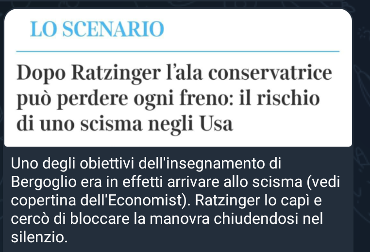 Va da sé che se la morte di Benedetto XVI ha gettato in un profondo sconforto persino un miscredente come il sottoscritto, inevitabilmente abbia addolorato molti dei credenti più ortodossi che, nonostante le dimissioni di ben dieci anni fa, non avevano mai smesso di considerarlo il vero Papa - e di considerare Papa Francesco come un non Papa o peggio l'antipapa - mentre paradossalmente è stata vista con favore dai fan di Papa Francesco, per i quali Ratzinger era soltanto il reflusso di una Chiesa vecchia e anacronistica. Si può certamente dissentire da questa contrapposizione così rigida, si può legittimamente guardare con preoccupazione alla nascita di una corrente tradizionalista all'interno della Chiesa che sembra spesso sconfinare nell'ortodossia, ma il dato di fatto che oggi all'interno della Chiesa vi sia in atto una faida tra tradizionalisti e progressisti che può portare ad uno scisma non lo dico certo io, ma lo afferma Gerhard Muller, ratzingeriano di ferro, ritenuto da molti un acerrimo nemico di Bergoglio, anche se questo cardinale rifiuta - come è ovvio che sia - tale contrapposizione, pur non negando il rischio. E tuttavia, che si sia affrettato a smentirlo, assomiglia più a scuse non richieste che come dicevano i latini, manifestano una colpa. Questo introduce la domanda: la Chiesa ha ancora un futuro? Che Dio abbia un futuro su questo ci sono pochi dubbi perché la sete di trascendenza nasce con l'uomo e morirà con l'uomo. Il punto è capire se lo abbia la Chiesa, se lo abbia Cristo e tutto ciò in cui i cristiani hanno creduto in ben 2023 anni. E non è possibile rispondere a questa domanda se prima non si tenta di spiegare cos'è stato Benedetto XVI e perché, presso i credenti più tradizionalisti, la sua morte è stata vista con profondo dolore.
