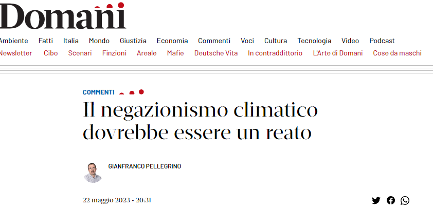 L'emergenza covid ha inaugurato una nuova categoria: i negazionisti del virus e dell'efficacia del vaccino, i quali sono stati sottoposti ad una delle più violente macchine del fango che la storia ricordi. A partire dal termine "negazionisti", il cui uso e abuso serviva ad equipararci agli antisemiti, in modo da promuovere l'automatismo che chi non si vaccina voglia bruciare gli ebrei nei forni. Noi che non abbiamo creduto alla narrazione ufficiale, ci siamo beccati in ordine sparso dei "ladri", dei "criminali", dei "parassiti", dei "figli di Putin", dei "disinformatori", dei "terroristi", è stato proposto di intubarci e di farci morire sparando ossigeno nei tubi, di lasciarci morire, di venire a prenderci per il collo (suggerimento dell'ultima martire della RAI, Lucia Annunziata) ed altre carinerie, la più lieve delle quali è stata quella che siamo dei ritardati mentali. Domanda: credete che questo abbia cambiato di una virgola la scelta da parte nostra di non vaccinarci e di non credere ad una parola di tutta questa storia? Nel mio caso, essendo tra costoro, quanto sopra mi ha soltanto confermato che ho fatto bene ad affrontare il tutto come l'ho affrontato. E dopo che un'alluvione di fatto ha smentito tutte le imbecillità raccontateci sulla siccità e sono arrivati nuovi esperti a suggerirci che la colpa è della nostra auto al metano e delle nostre case - tradotto, a breve arrivano altri pretesti per toglierci diritti e denari - ecco che arriva la nuova proposta da parte di Domani, il giornale di De Benedetti: far diventare reato il negazionismo climatico, cioè mettere autoritativamente a tacere qualsiasi voce che osi dissentire.