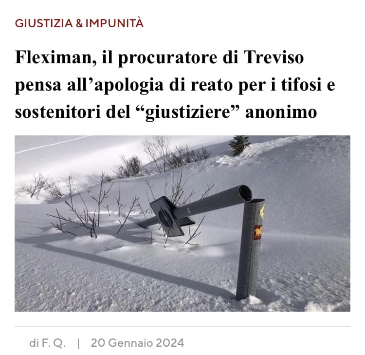 La situazione tra il potere e il popolo non è certo delle più rosee e, in una democrazia, in teoria le classi dirigenti non dovrebbero vantare maggiori diritti rispetto ai cittadini. E' tenendo conto di questa premessa che leggo la notizia che il procuratore di Treviso stia pensando di perseguire penalmente i sostenitori del giustiziere anonimo degli autovelox, per tutti Fleximan.