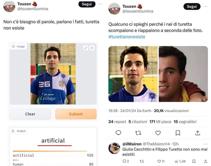 Anche per questo, sono sostanzialmente indifferente alla vicenda di Filippo Turetta e anche della fidanzata da lui assassinata, Giulia Cecchettin. Sui social è diventato virale il post di un utente - che tra l'altro è anche tra i miei contatti - che sostiene che il volto di Turetta, l'assassino di Giulia Cecchettin, non sia reale ma sia, semmai, frutto dell'intelligenza artificiale.
