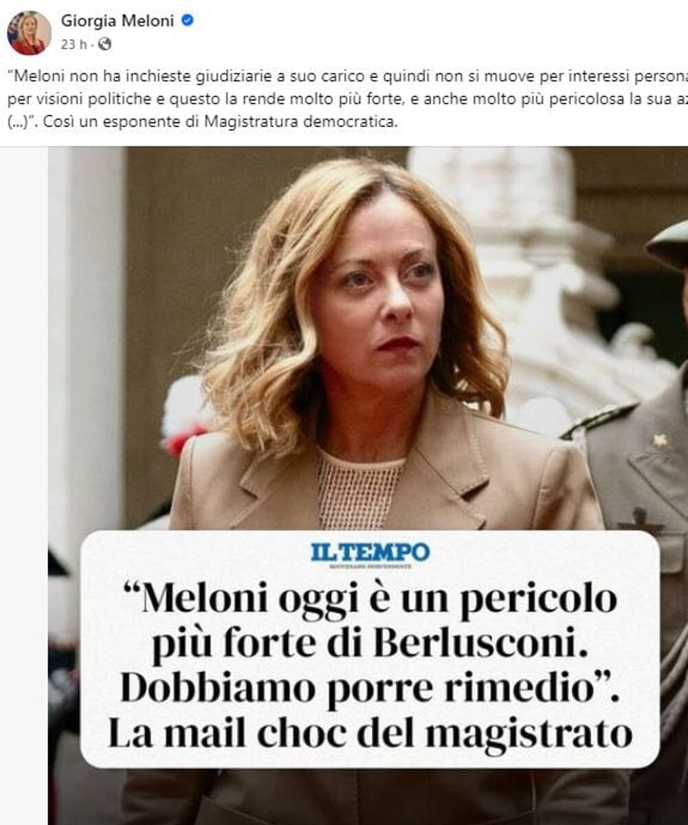 Nella giornata di ieri, circolava una notizia falsa, ossia che un magistrato, Marco Patarnello, che pare che faccia parte di Magistratura Democratica, avrebbe scritto in un'email: "Giorgia Meloni è più pericolosa di Berlusconi. Dobbiamo porre rimedio". In realtà, la famosa email segreta altro non è che un messaggio inviato all'interno della mailing list dell'ANM, dove qualsiasi magistrato può intervenire dicendo la sua opinione sulle vicende relative alla giustizia. E il procuratore in questione, se l'email viene riletta nel modo corretto, non dice che "bisogna porre rimedio alla Meloni", ma, pur denunciando un attacco della politica all'indipendenza dei magistrati, tuttavia fa un'analisi molto più complessa che, riletta in maniera onesta e corretta, non è eversiva come si potrebbe pensare dai titoli e dai riassunti di giornalisti che non si rendono conto che diffondendo notizie false, non fanno che danneggiare le cause che sostengono.
