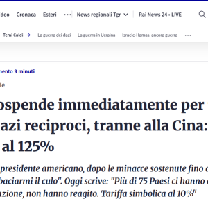 Amici di centrodestra, in Italia non comanda il PD; in Italia e in Europa comandano gli angloisraeliti. Finché resteremo sotto il loro giogo avremo governi deboli, dissipazione, piciernismo trionfante e lavaggio "progressista" del cervello. Sanzioni e guerra delle tariffe rappresentano un'occasione unica e forse irripetibile per diversificare fornitori e mercati. Ma voi quest'occasione ve la lascerete scappare. Perché? Semplice: siete figli della cultura fasciobadogliana, conforme in tutto e per tutto alla cultura cattocomunista. Volete un esempio? Polemizzate con la sinistra e l'ANPI, ma siete entrambi atterriti dal riarmo tedesco. Piú badogliani di così! Originally posted in: