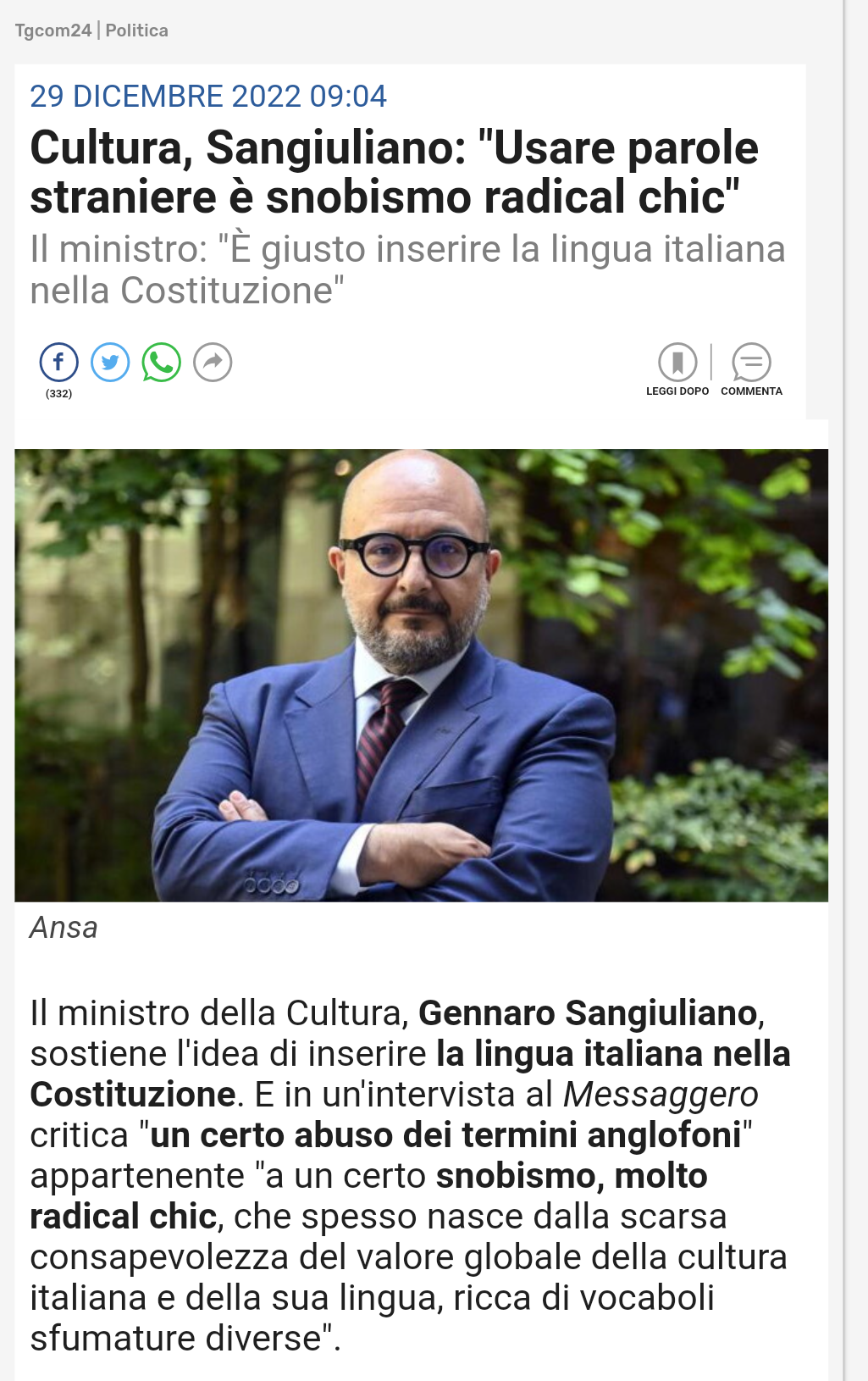 Il ministro della cultura Gennaro Sangiuliano: "Usare parole straniere è snobismo radical chic." Radical chic è una nota espressione italiana. Il sovranismo linguistico e alimentare è un gatto castrato che cerca disperatamente di montare un cuscino. Originally posted in: