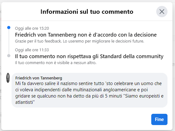 Sto seguendo con interesse la vicenda. Devo dire che la tua impostazione è piuttosto acuta. Il paragone con Trump è proprio ciò che Musk deve aver avuto presente per non buttarsi in qualche mossa dissennata. Ma mi ha colpito di più la tua disamina sulla meccanica perversa che governa i social più diffusi, quelli di supporto al Regime: proprio io, da febbraio, sono stato bannato a raffica per aver pubblicato controinformazione sulla guerra in Ucraina e sono passato per qualcosa come sette profili. Oggi mi hanno bannato per un commento a caso, che solo un malato di mente o qualcuno in malafede avrebbe potuto considerare sospetto. FB è il primo a violare i propri ridicoli e a volte misteriosi standard, e per quello ho sempre rifiutato di dargli accesso ai miei dati personali. I like come droga sono proprio ciò che accade: se hai letto "Mind change" di Susan Greenfield avrai trovato che essi liberano dopamina, ed è proprio il meccanismo patologico su cui si regge il gioco. Gioco di cui mi sto davvero stufando.