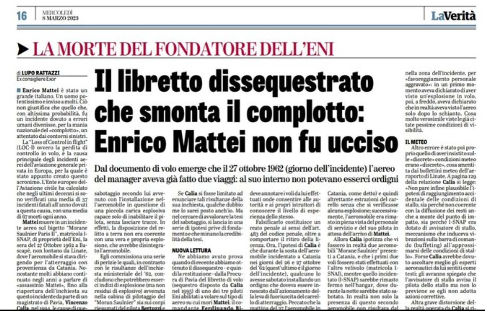 8. Enrico Mattei è morto di freddo. Parola di Lupo (sic) Rattazzi, figlio di Susanna Agnelli. Il nuovo corso degli Angelucci comincia col botto. Il progressista mentaniano e il destrorso cuckold esultano.